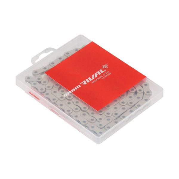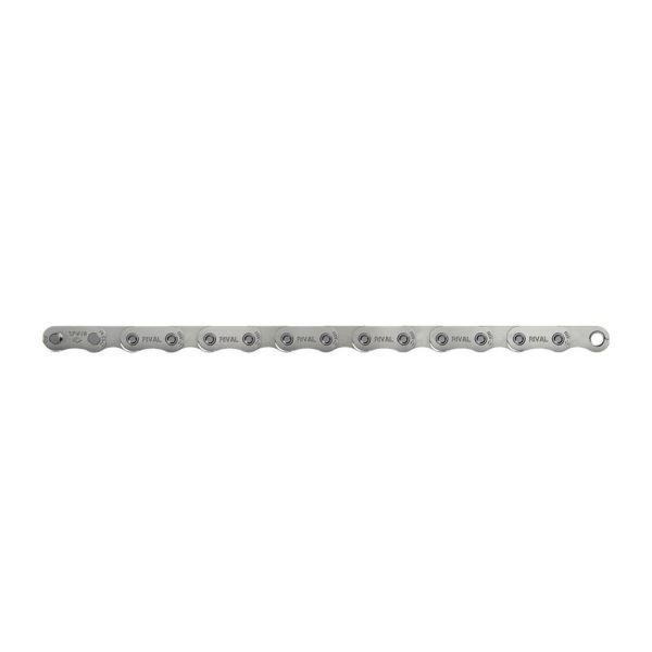 La cadena SRAM Rival se sujeta con el cierre de cadena PowerLock™ y es especialmente adecuada para transmisiones electrónicas eTap AXS de 12 velocidades. Tanto con una o con dos velocidades, la cadena estrecha funciona silenciosamente y se caracteriza por su durabilidad, gracias a la tecnología Flattop.
