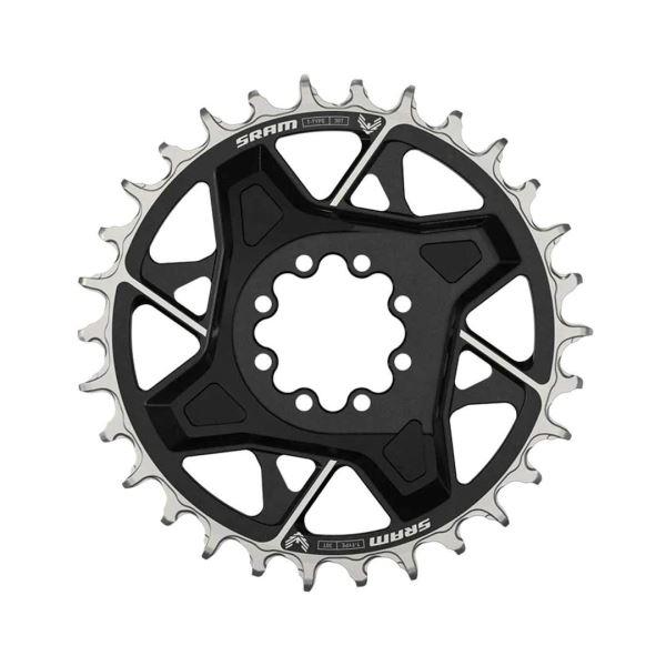 Plato T-Type de SRAM de la robusta serie X0 Eagle Transmission para Cross Country a Enduro tiene un offset de 3 mm y se fija mediante Direct Mount con 8 tornillos. Brilla con un aspecto llamativo y está optimizado para la interacción con cadenas de T-Type